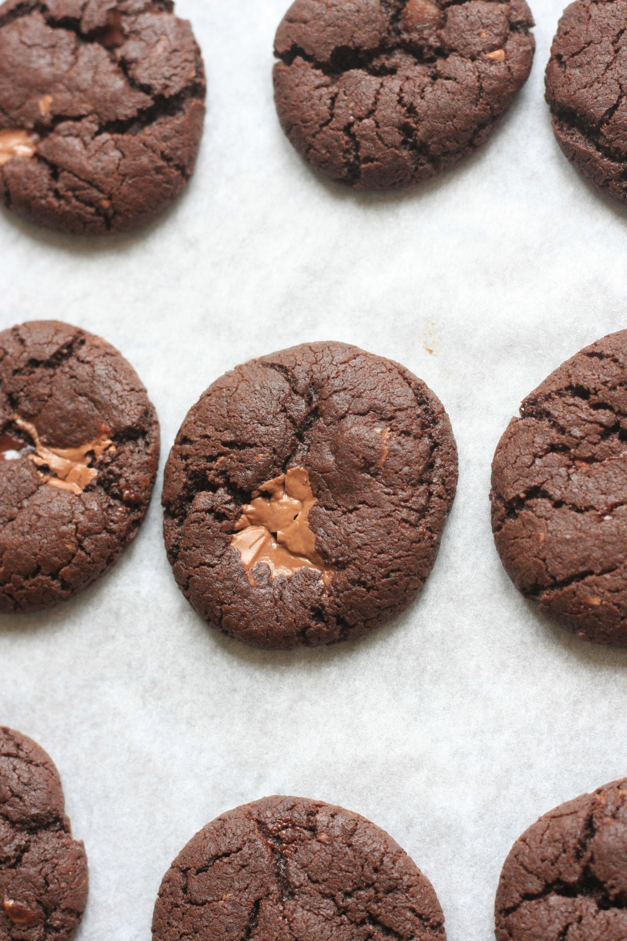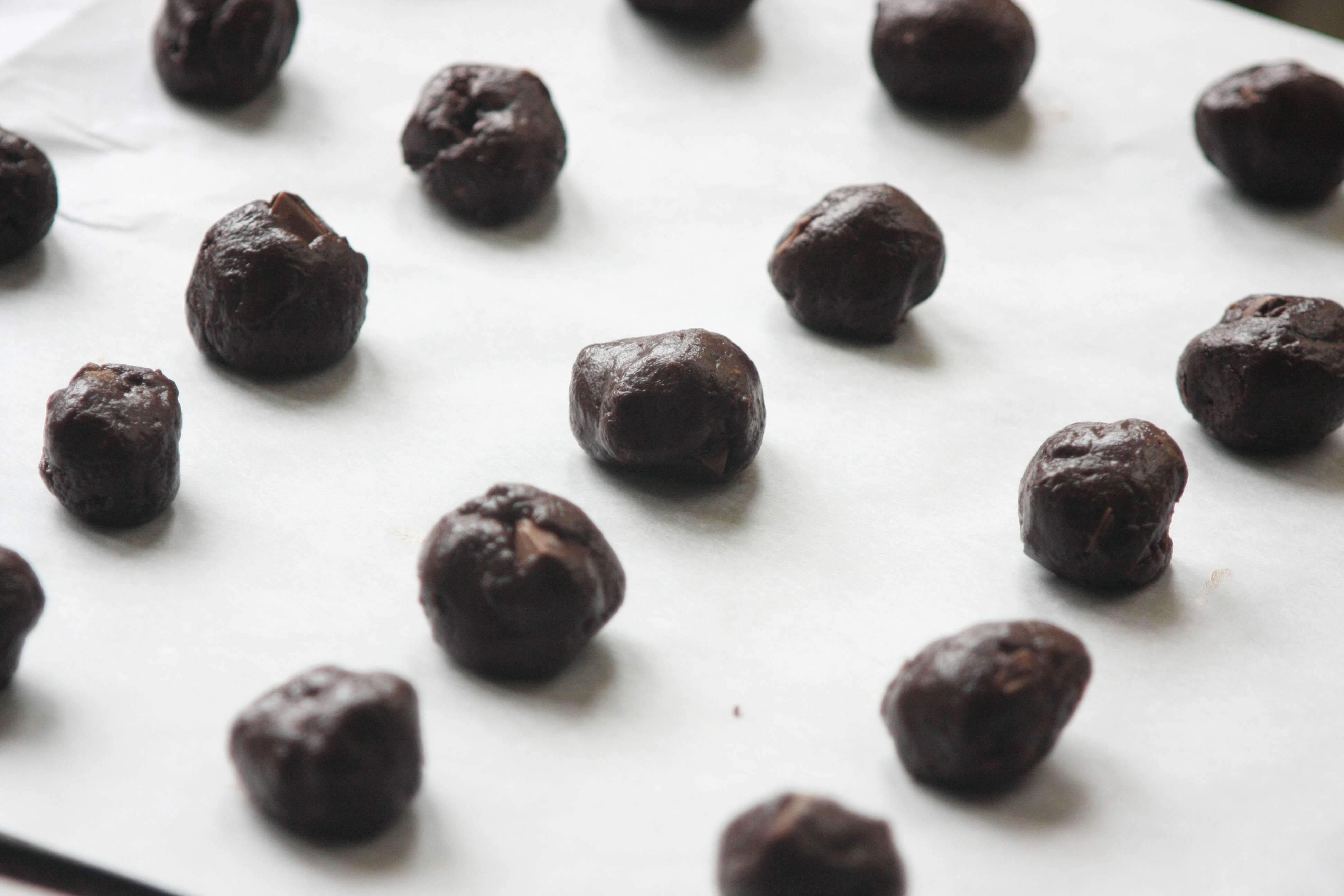 Form into balls on the parchment lined cookie sheets and bake for 10 or 11 minutes or until just barely firm (they will lose that doughy sheen). Do not overbake! Let cool and then enjoy alone or filled with peanut butter and a sprinkle of sea salt.