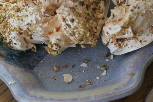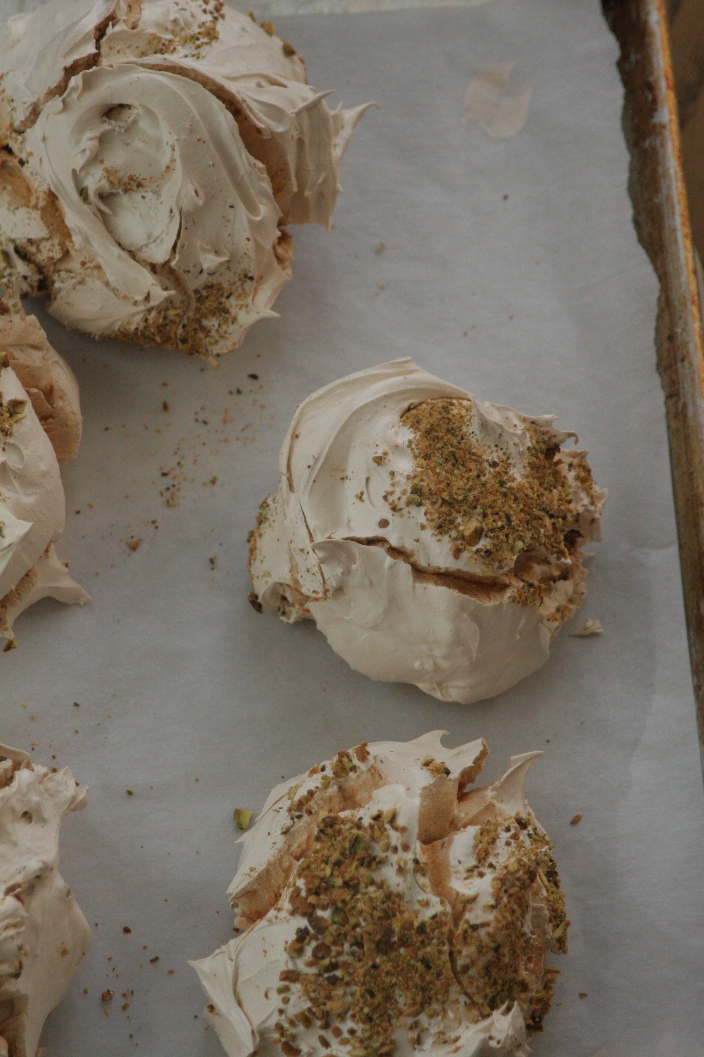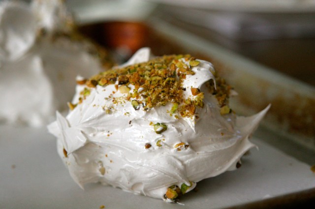5. Line a baking sheet (the one you just used for the sugar is fine) with parchment and dab just a tiny bit of the meringue batter under each of the four corners to secure it. With two gargantuan kitchen spoons mold a grapefruit-sized dollop of meringue, roll it onto your plate of pistachio nuts, and place on the parchment. Repeat, making room between meringues since they will expand and crack a bit as they cook. They should each look different and very free-formed.