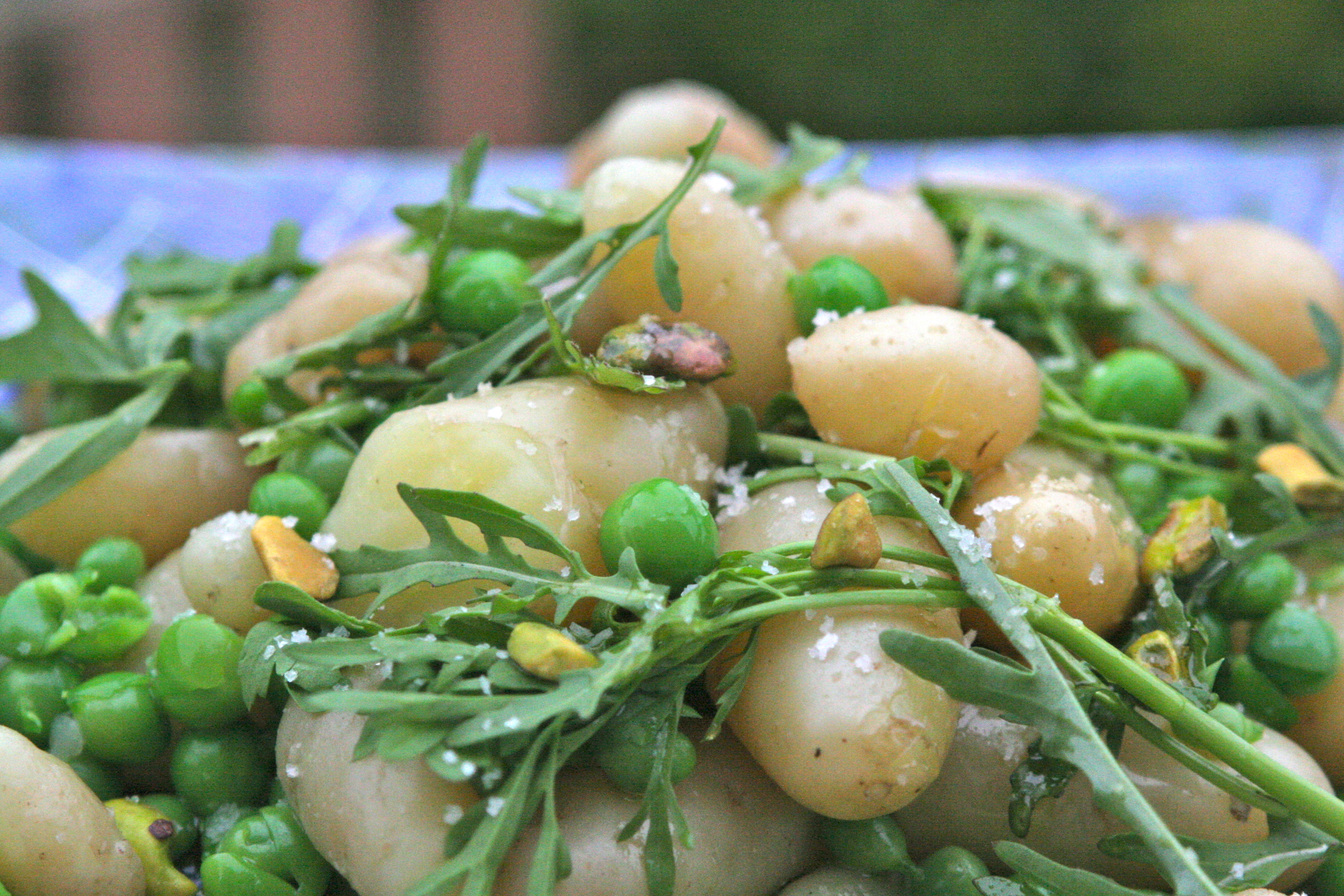 I decided to make a slightly warm dinner salad with barely cooked blanched peas and new potatoes (Rose Apple Finn, a fingerling variety). I have rhapsodized on new potatoes before, but I enjoyed them even more last night, mostly because we had more of them, two even the size of the larger peas! The reality is that those two vegetables stand alone with just a dusting of salt and either butter or wonderful extra virgin olive oil. I couldn’t resist fancying it up a bit more, however with some wild arugula, regular arugula, and peppercress all from our garden as well. Add a handful of toasted pistachios and you are ready to go.
